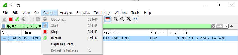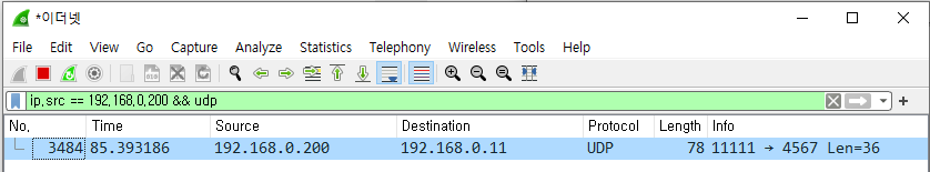 만약 Source 주소가 192.168.0.200 인 udp 패킷만 보고 싶다면 ip.src == 192.168.0.200 && udp 로 필터링 하면 된다.