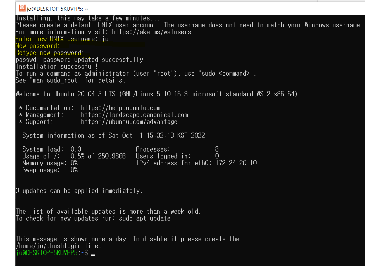 명령 프롬프트에서 bash 입력시 WSL 환경으로 바로 접속할 수 있다.