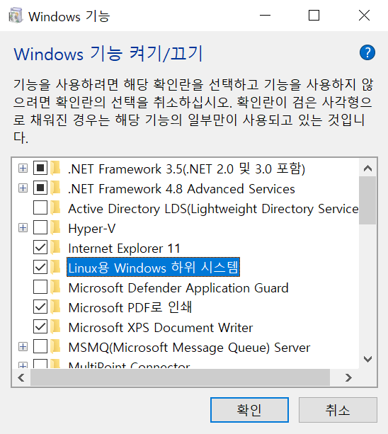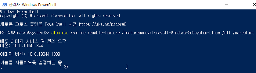 만약 "중간에 시스템을 부팅할 필요가 없습니다." 라는 오류 메시지 나온다면 powershall 에서 아래와 같이 입력하거나 Windows 기능 켜기/끄기를 확인한다.
