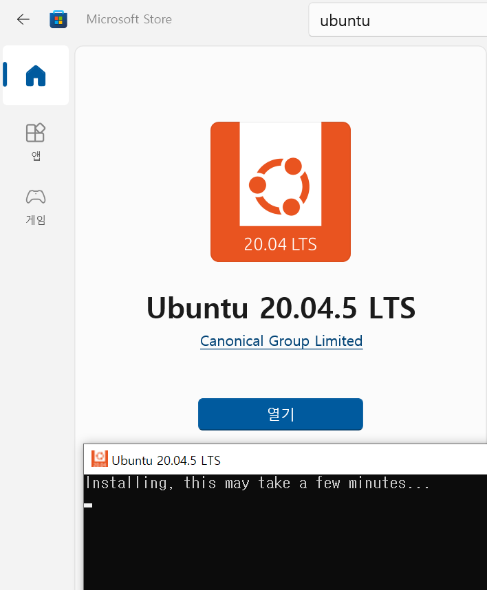 7. Microsoft Store 에서 리눅스 배포판을 LTS 버전으로 설치한다. 설치 후 열기 버튼 클릭