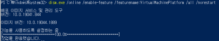 3. Virtual Machine 플랫폼 옵션 기능을 사용하도록 설정하기 위해 powershall에서 다음과 같이 입력한다.