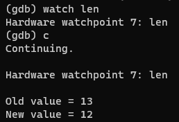 - rwatch 변수명 : 변수의 값이 읽혀질 때마다 브레이크