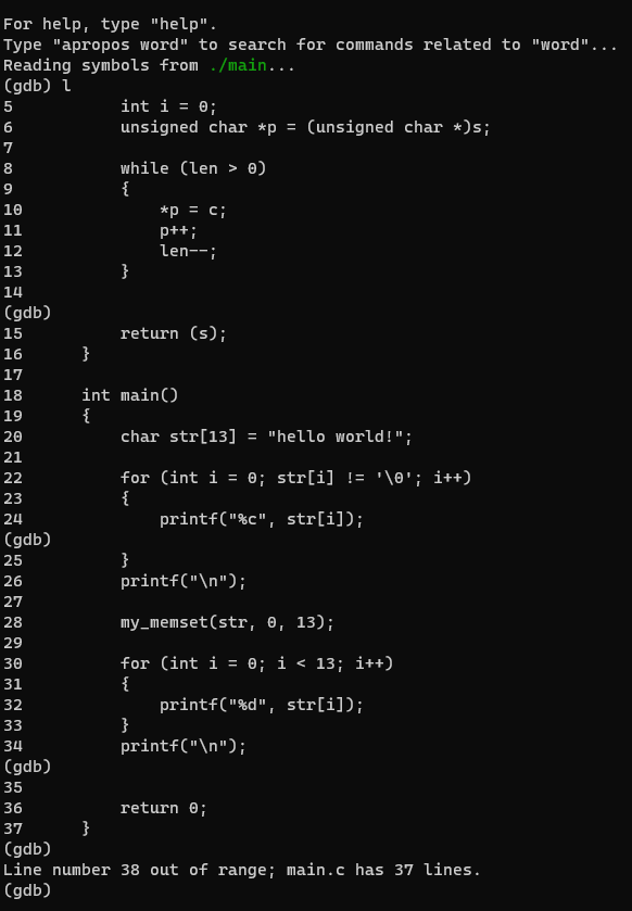 - set listsize 20 : l 명령의 기본 출력 코드 수를 20라인으로 설정