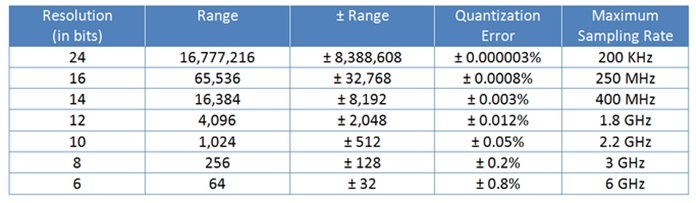 샘플링 속도(Sampling rate)와 해상도(Resolution)는 ADC 선택에 있어서 가장 중요한 기준이 된다. 일반적으로 저속의 ADC는 높은 해상도로 데이터 변환이 가능하고, 고속의 ADC는 저해상도의 데이터 변환이 이루어진다.