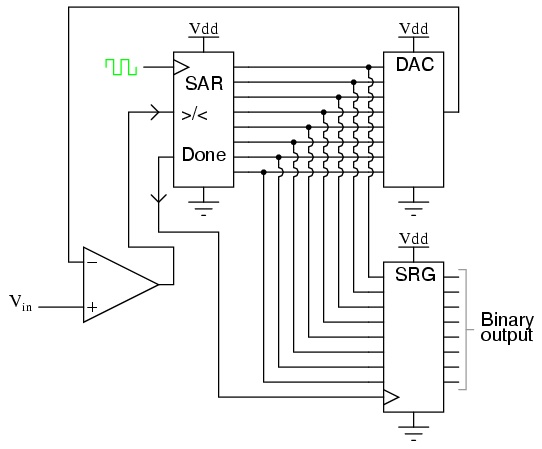 SAR(Successive Approximation Register)로 최상위 비트에서 하위 비트 쪽으로 순서대로 수정하는 방법을 사용하여 DAC의 출력을 빠르게 아날로그 입력전압에 근사시킬 수 있다. 그래서 비교적 변환시간이 빠르고 회로도 간단하여 저렴하다는 장점을 갖고 있다. 저가형이면서 분해능이 비교적 높은 ADC에 주로 사용되며, SAR은 입력 전압이 항상 일정해야 하기 때문에 S/H가 필요하다.