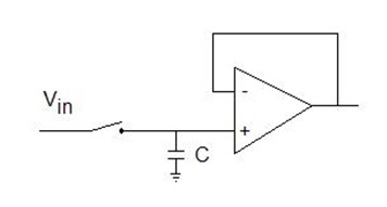 아래 S/H 회로에서 스위치는 평소에 열려있다가 측정값을 얻고자 할 때 잠시 닫힌다.