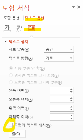 텍스트 박스 우클릭 - 도형 서식 - 텍스트 옵션 - 텍스트 상자 - '도형의 텍스트 배치' 체크 해제