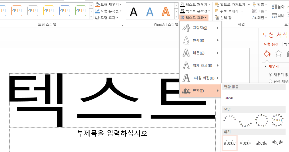 서식 - 텍스트 효과 - 변환 - 휘기 - 사각형