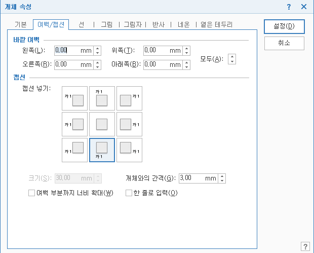 표 또는 그림 오른쪽 클릭 후 개체 속성 클릭 - 여백/캡션 탭