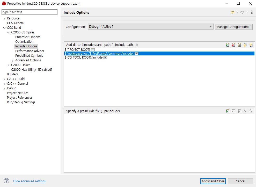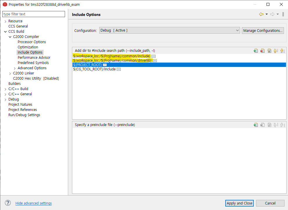 만약 2번 프로젝트에서 driverlib도 사용하고 싶다면 common\include 폴더에 device.h, driverlib.h 를 복사해 추가하고 common\source 폴더에 device.c 를 추가한다. 그리고 1번에 추가했던 것처럼 common 폴더 밑에 driverlib 폴더를 추가해 넣고 Properties - Build - Compiler - Include Options 에서 추가한 driverlib 폴더 경로를 추가해준다. 그리고 Predefined symbol 에 _DUAL_HEADERS 를 추가한다.