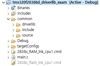 3. C:\ti\c2000\C2000Ware_4_02_00_00\device_support\f2838x\common\include 경로에서 device.h, driverlib.h 파일을 복사해 프로젝트 common\include 폴더 안에 paste 한다.