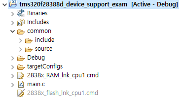 4. C:\ti\c2000\C2000Ware_4_02_00_00\device_support\f2838x\common\source 경로에서 f2838x_codestartbranch.asm, device.c 파일을 복사해 프로젝트 common\source 폴더 안에 paste 한다.