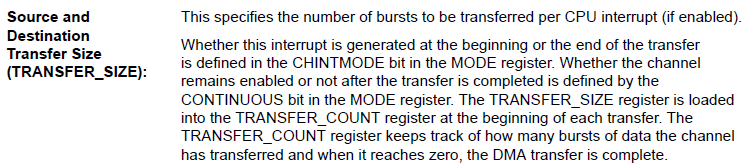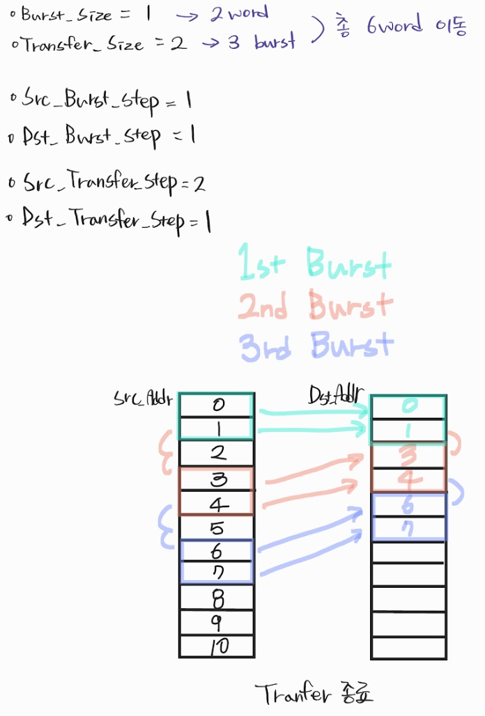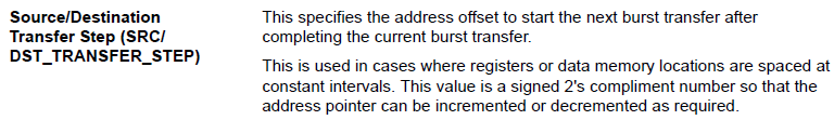 - SRC/DST_TRANSFER_STEP : 직전 Burst가 끝나고 다음 Burst가 시작하기 전에 source/destination 주소값을 몇씩 증가/감소시킬지에 대한 설정. 0 또는 양수/음수값을 설정할 수 있다. 이 설정은 레지스터나 메모리에서 Reserved 영역이 있을 때 피해하기 위해 사용할 수도 있다.