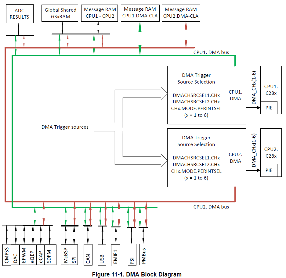 DMA 가 접근가능한 페리페럴과 메모리 영역에 대해 나와있다. 특히 메모리쪽을 보면 RAMGS는 접근가능하지만 RAMM 이나 RAMLS는 접근을 못한다.
