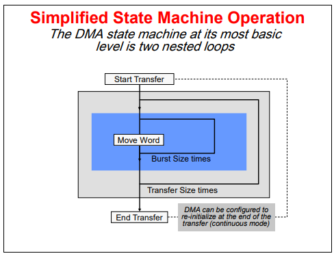 DMA 의 작동방식은 그림과 같이 중첩 루프로 되어있고, 안쪽 루프가 Burst 바깥쪽 루프가 Transfer이다. 처음 Transfer가 시작되면 TRANSFER_SIZE 만큼 Burst가 일어나야 Transfer가 종료되는데 이 Burst는 그냥 일어나는게 아니라 페리페럴 또는 소프웨어 트리거가 발생했을 때 한번의 Burst(ONE Shot Mode disabled 시)가 일어나는 것이다. 그리고 한번 Burst가 일어나면 BURST_SIZE만큼 word를 옮긴다.