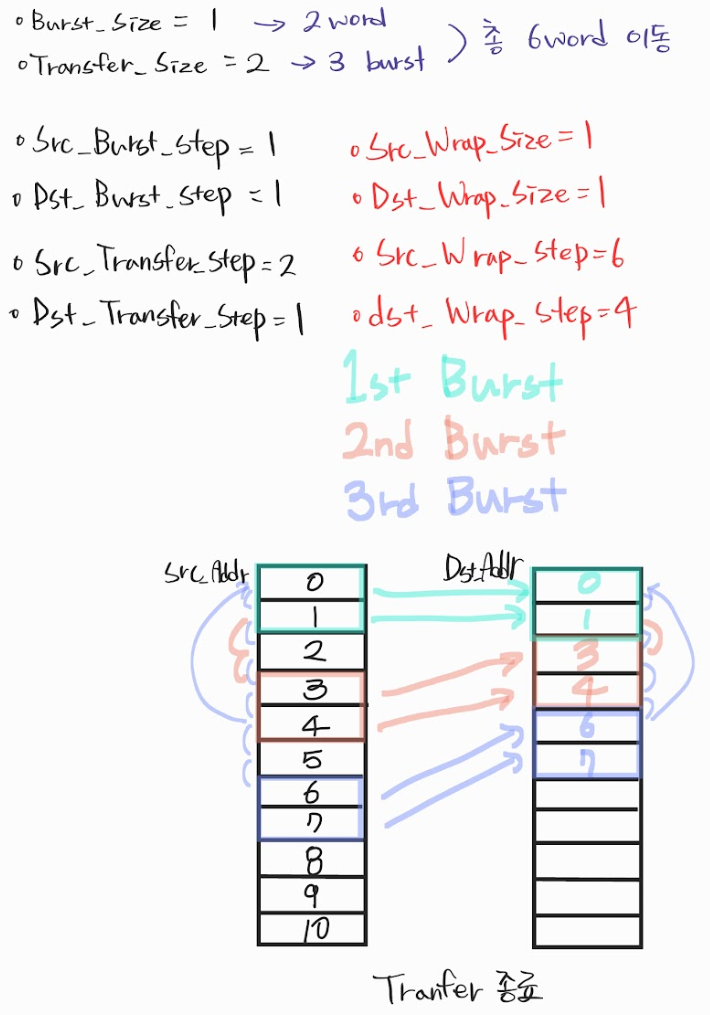 Source 쪽의 과정을 보면 SRC_WRAP_SIZE+1 인 두 번의 burst 후에 다시 처음 시작주소로 돌아가고 SRC_WRAP_STEP 인 6만큼 증가하여 다음 세번째 트리거가 오면 Src_Addr+6 에서 Burst를 시작하게된다.