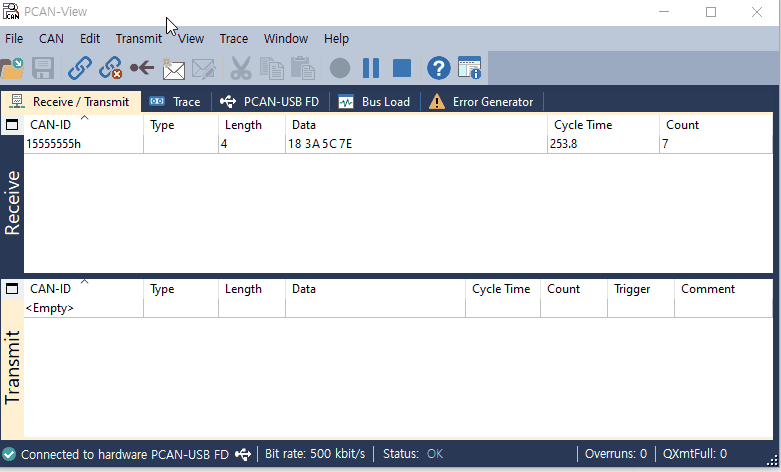 Cycle Time 을 설정해 Periodical 송신을 할 수 도 있고 Cycle Time을 0으로 설정한 경우, Transmit/Receive 화면에서 원하는 메시지를 선택하고 space bar 를 눌러 송신할 수 있다.