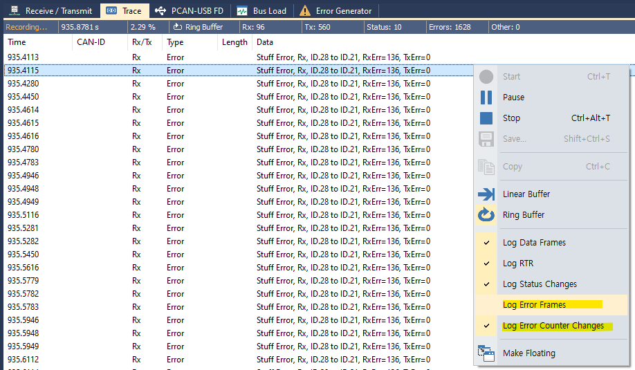 Trace 창 우클릭 > Log Error Frames, Log Error Counter Changes