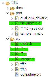 이 중에서 사용하는 건 port 폴더의 fat_usbmsc.c, src 폴더의 ff.c, ff.h, diskio.h, integer.h 뿐이다. 나머지는 삭제 또는 빌드제외 한다.