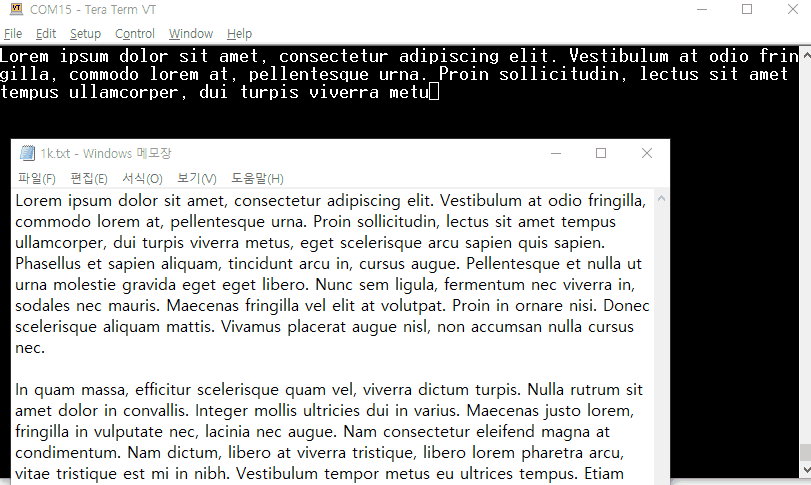 일부러 mail loop 안에서 500ms delay 주면서 led를 토글하게 해보았다. 그리고 테라텀을 통해 1Kb의 텍스트 파일을 전송했다.