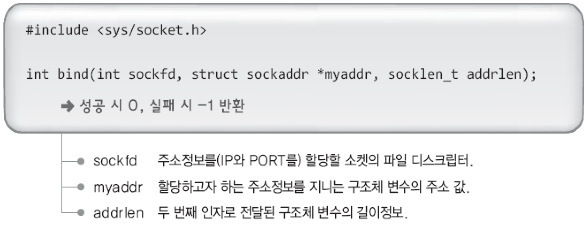 bind 함수의 두번째 매개변수로 전달되는 것은 위에서 소개한 sockaddr_in이 아니라 sockaddr 구조체 변수의 주소값이다. sockaddr 구조체변수는 IPv4 만 아니라 이외의 주소정보도 담을 수 있는 구조체지만 구조를 살펴보면 정보를 담기에 불편하게 정의되어 있다.