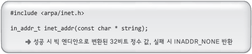 ✔ 데이터 송수신 과정에서는 네트워크 바이트 순서로 자동 변환이 이뤄지기 때문에 sockaddr_in 구조체 변수에 데이터를 채울 때만 바이트 순서를 신경쓰면 된다.