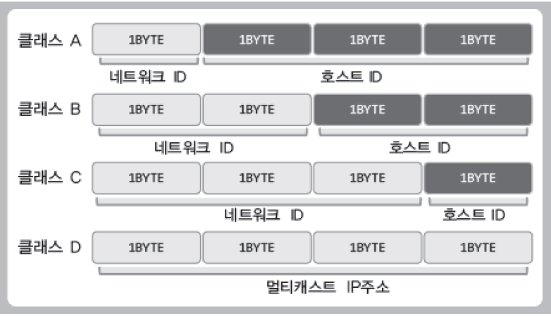 IP 주소의 첫번째 바이트만 참조해도 네트워크 주소가 몇 바이트인지 판단이 가능하다.
