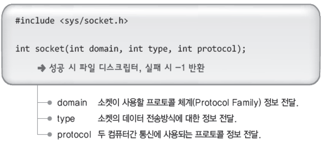 첫번째, 두번째 인자로 전달된 정보를 통해 소켓의 프로토콜이 사실상 결정되기 때문에 세번째 인자로 0을 전달해도 된다.