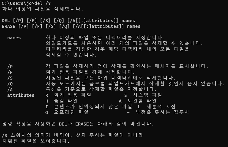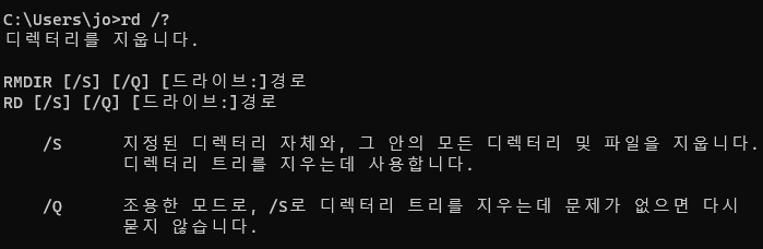 rd 는 디렉터리를 지우는 명령어인데 명령 프롬프트에서 rd /? 를 쳐서 설명을 볼 수 있다.
