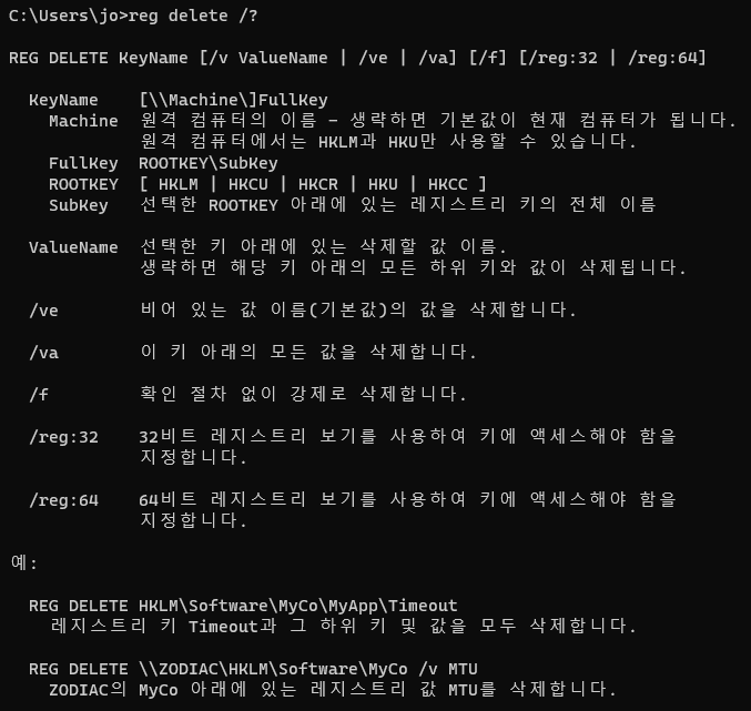 레지스트리에서 값을 다시 삭제하는 명령어는 다음과 같다.