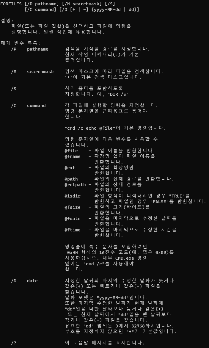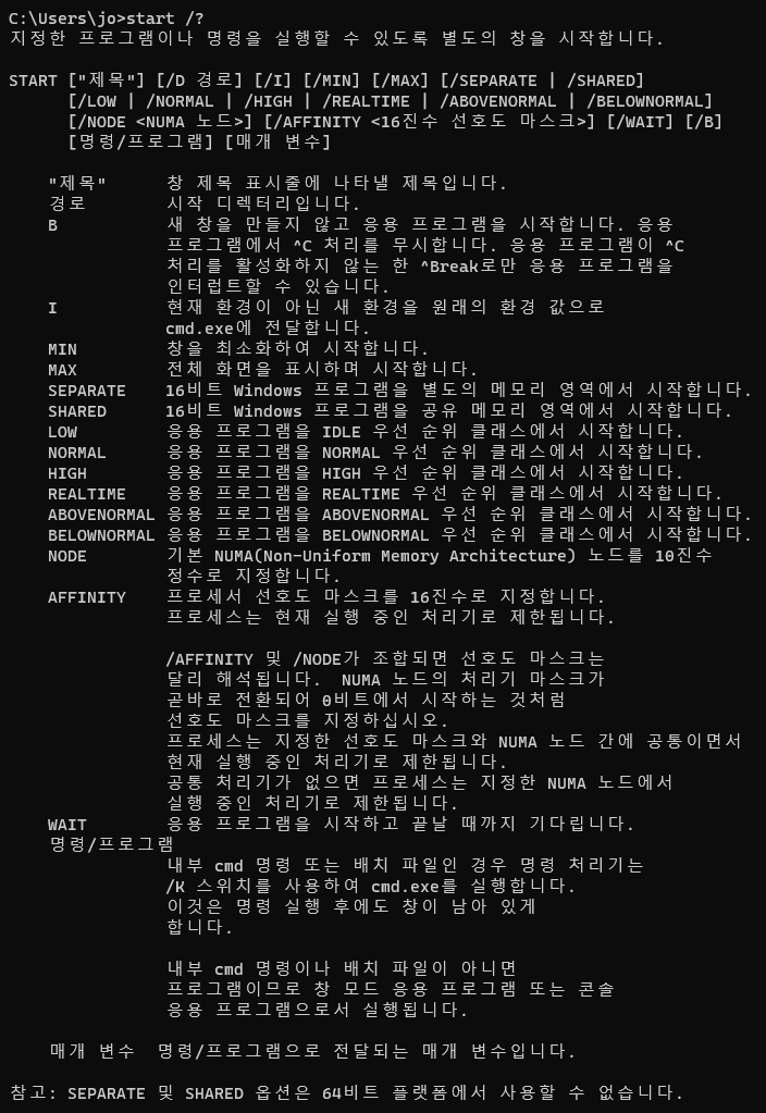 한편 배치파일 내 주석을 작성할 때는 앞에 rem 또는 ::을 붙이고 작성할 수 있다.