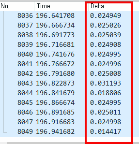 지금 캡쳐하는 패킷은 40Hz 전송하게끔 해두어서 간격이 대략 25ms 로 측정되고 있다.