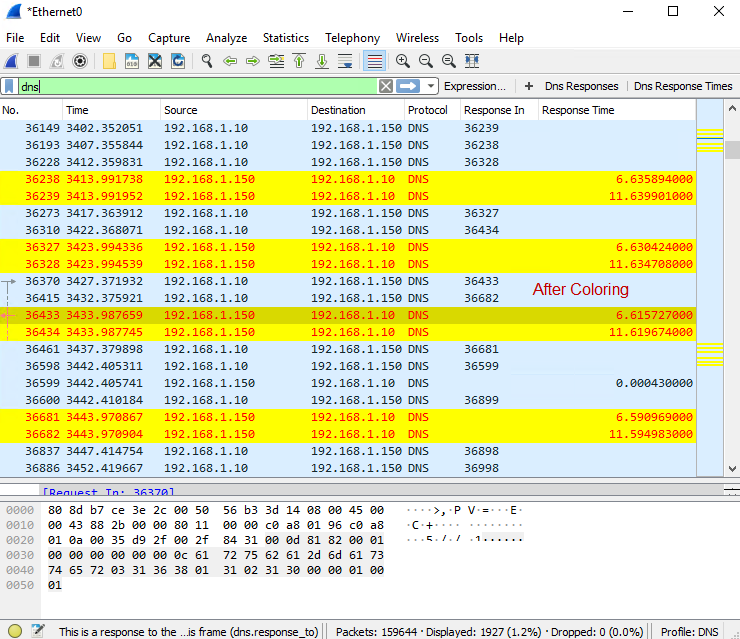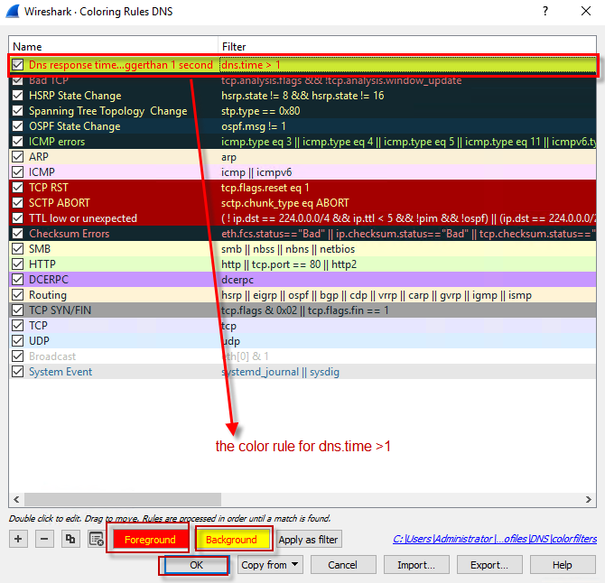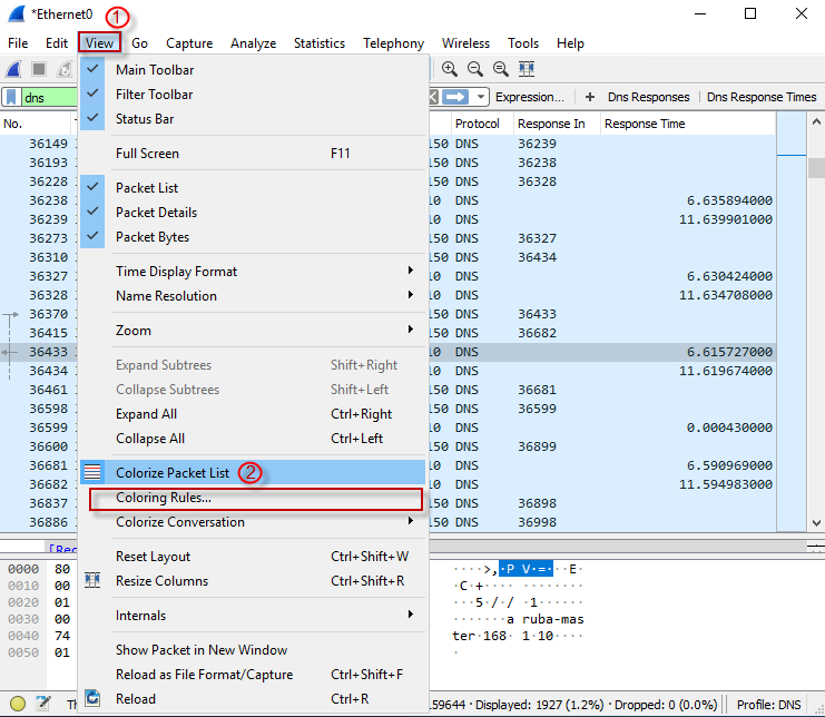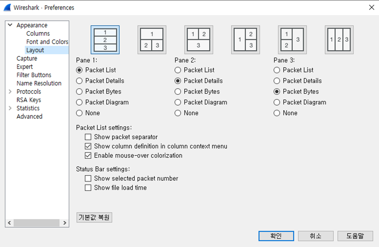 일반 디스플레이 필터 외에도 컬러필터를 추가로 사용하여 관심있는 패킷을 강조하여 볼 수 있다.