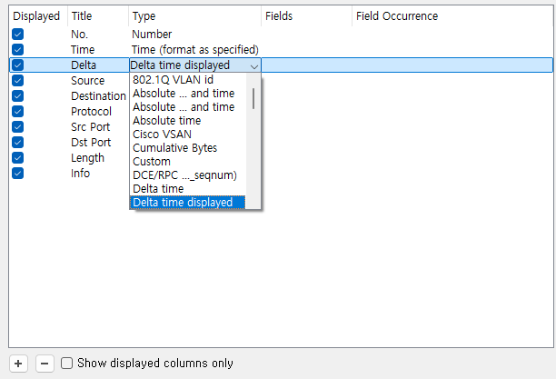 Type이 Delta time과 Delta time displayed 두 가지가 있는데 'Delta time displayed'를 선택해야 Display filter로 캡쳐된 패킷에 한해서 이전 패킷과의 간격을 표시한다.