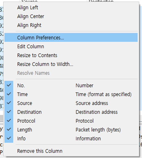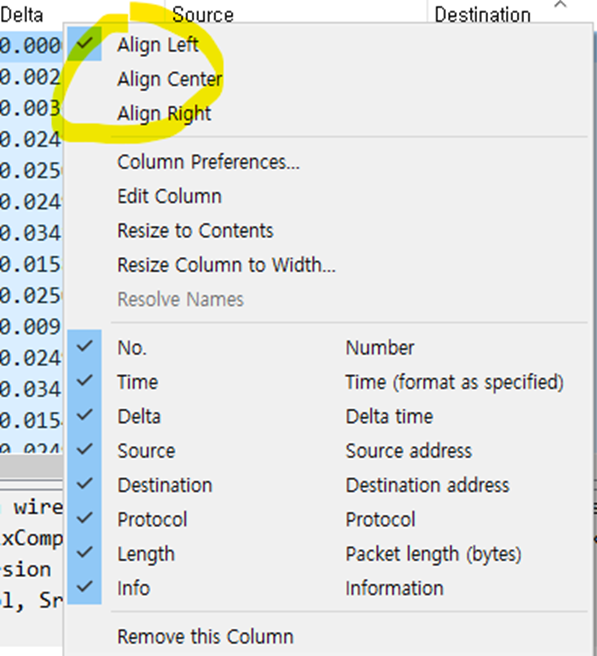 이렇게 하면 직전에 캡쳐된 패킷과의 간격을 알 수 있다. 다만 필터를 잘 설정 해두어야 이 Delta time이 의미가 있다.