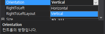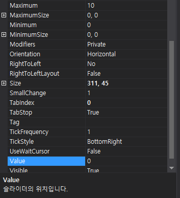Orientation 속성을 Verical로 하면 세로방향 TrackBar를 생성할 수 있다.