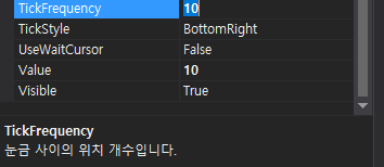TickFrequency 속성을 통해 Maximum 과 Minimum 사이 표시될 눈금 개수를 설정할 수 있다.