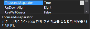 ThousandsSeparator 속성을 True로하면 1000단위 구분기호를 삽입할 수 있다.