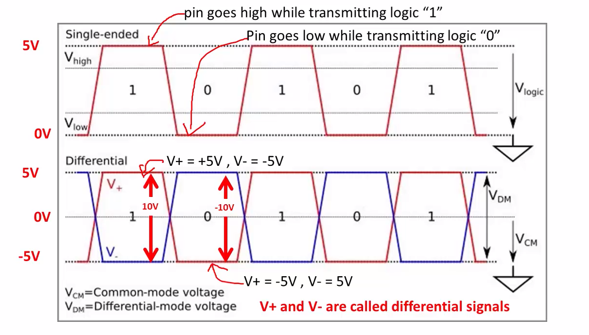 하나의 데이터를 보내는데 서로 반대되는 극성을 갖는 2개의 라인을 사용한다. 라인1이 5V 라인2가 -5V일 때, 수신자는 두 신호간 전압차이를 보고 해석을 하며 신호차이가 10V이면 이를 로직1로 해석한다. 반대로 라인1이 -5V, 라인2가 5V로 전압차가 -10V인 경우 수신자는 이를 로직0으로 해석한다.