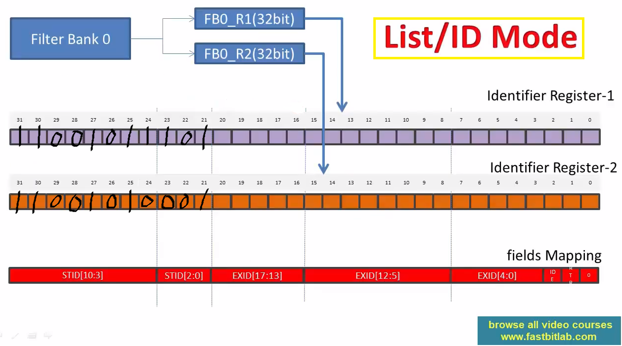 - List / ID Mode 를 사용하는 경우 R1 은 Identifier Register-1 이 되고 R2 는 Identifier Register-2 가 된다. 각 Register 에 매치 여부를 체크할 Identifier 를 넣으면 된다.