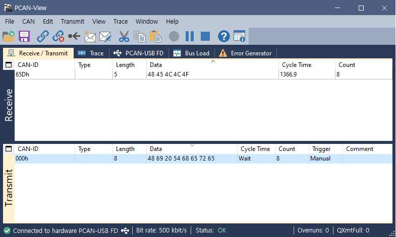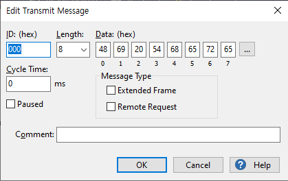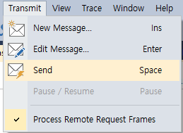 PCAN-View 에서는 New Transmit Message 를 만들고 Cycle Time 을 설정해 Periodical 송신을 할 수 도 있고 Cycle Time을 0으로 설정한 경우 space 를 눌러 송신할 수 있다.