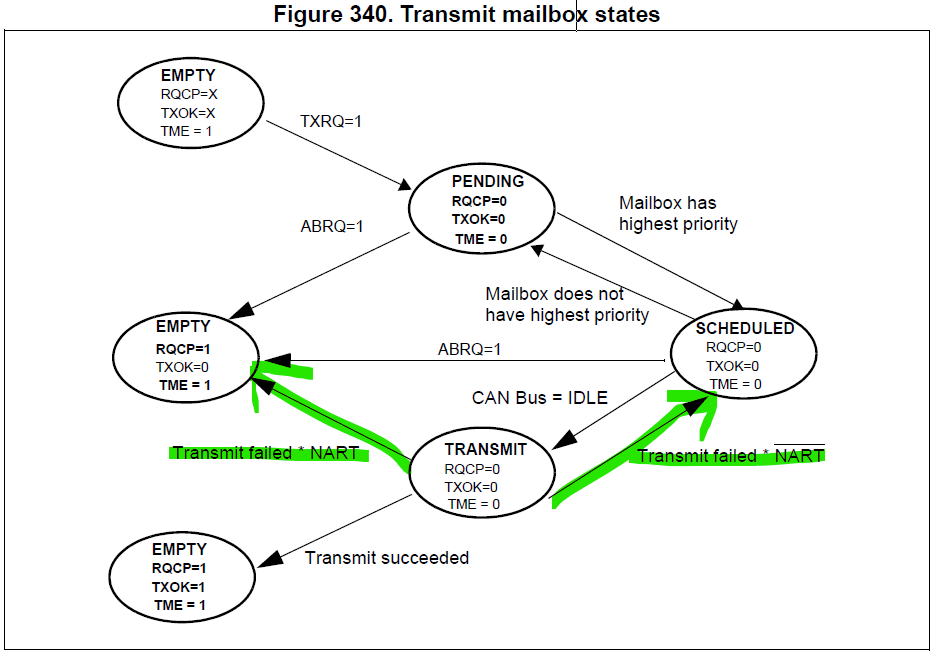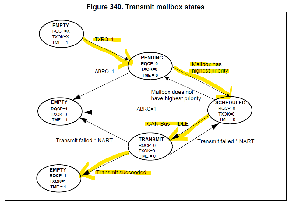 다음은 Transmit mailbox 의 상태도인데 이 그림을 이해하는 것이 매우 중요하다. STM 말고 다른 MCU를 써도 이런 CAN 컨트롤러 구조는 비슷할 것이다.