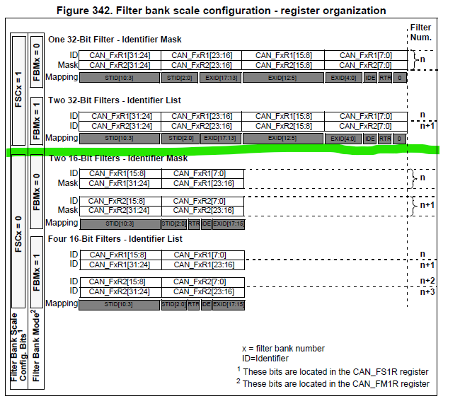 - FilterBank : initialize 할 Filter bank. Single CAN 을 쓰는 경우 14개의 Filter bank 만 쓸 수 있으며 0~13 사이의 값이 온다. Dual CAN 을 쓰는 경우 0~27 사이의 값이 온다.