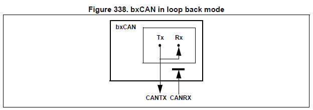 그림과 같은 구조로 bxCAN 컨트롤러가 송신한 프레임은 bus 에 올라가고 RX를 통해 그대로 loop back 될테지만 RX line이 bus 와 연결되어 있지 않으니 bus에 있는 프레임을 수신할 수 는 없다.