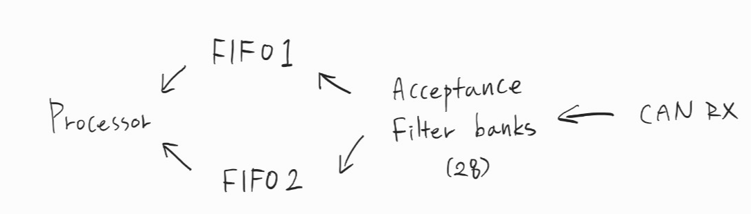 CAN RX 핀을 통해 들어온 수신 메시지는 Acceptance Filter Banks 를 맨 처음 통과한다.