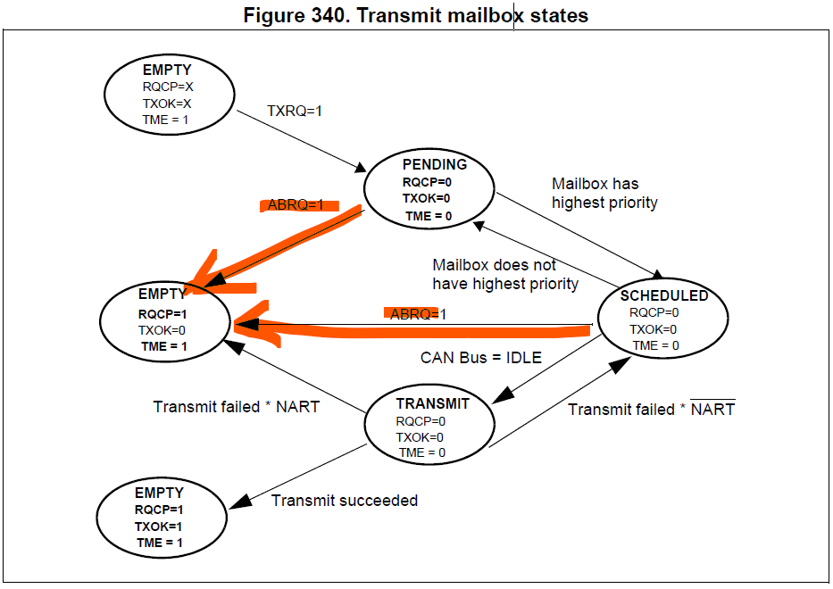 Pending state, Scheduled state 에 있는 메일박스를 ABRQ bit 를 set 함으로써 송신 중단시킬 수 있다.