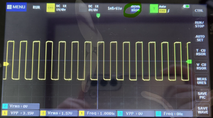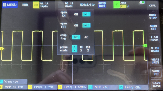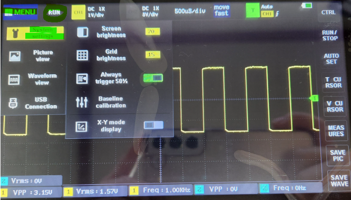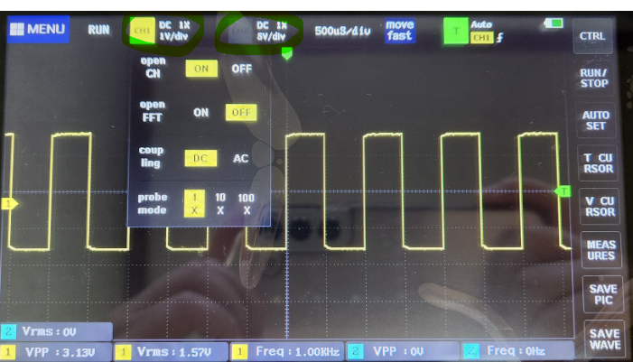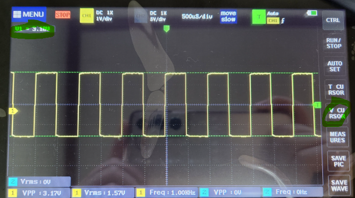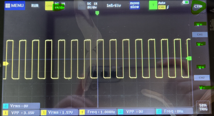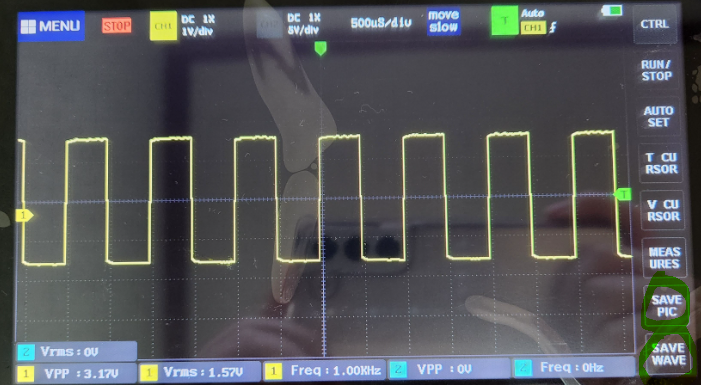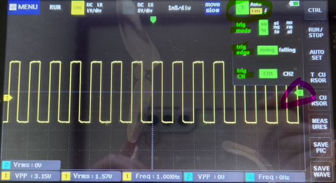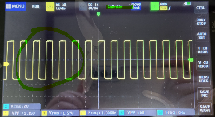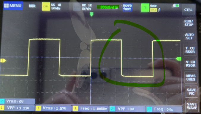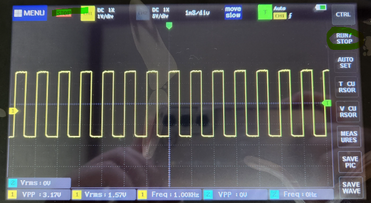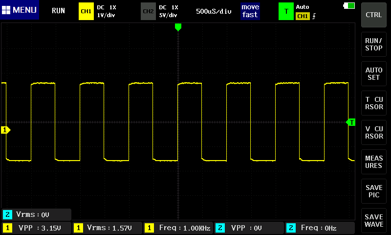 아래사진에선 한칸이 200uS인데 파형이 다섯칸을 차지하고 있으니 주기는 1ms이고 주파수는 1KHz 인것을 알 수 있다.