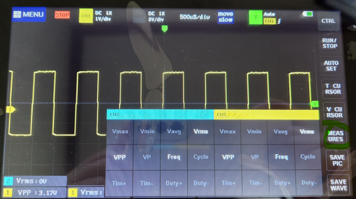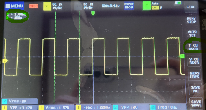 우측의 T CURSOR 를 클릭하면 초록색 세로 점선 두개가 뜨고 드래그앤드랍으로 위치를 이동 시켜 주기와 주파수를 측정할 수 있다. 좌측 상단에 측정값이 뜬다.