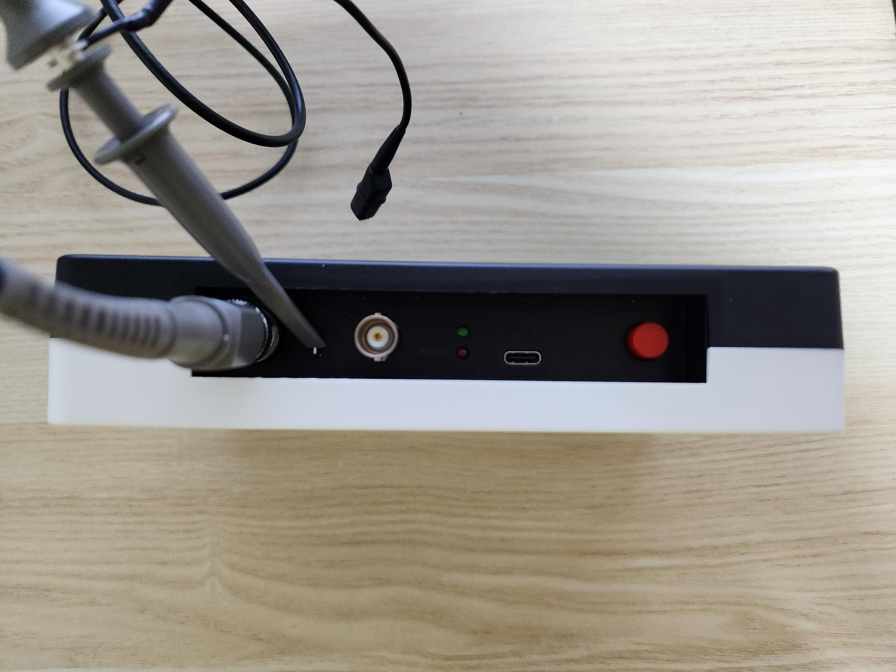 상단 프로브 커넥터 CH1, CH2. 파워 LED, C type 포트, 전원 버튼이 있다.