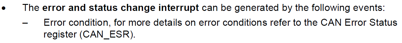 CAN_ESR 레지스터에서 다음의 Error Condition 이 감지되었을 때 Interrupt 가 트리거 될 수 있다.